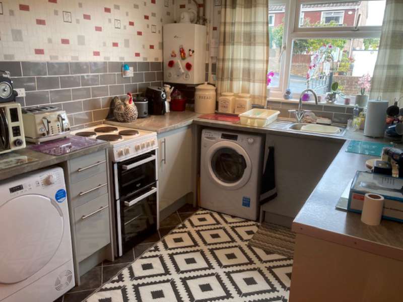 Range of modern base units with gloss fronts of cupboards and drawers, space and plumbing for washing machine, space and point for cooker, spaces for tumble drier, fridge/freezer, granite style work surfaces with tiled splashback, inset stainless steel sink and mixer tap. Wall mounted Worcester boiler.